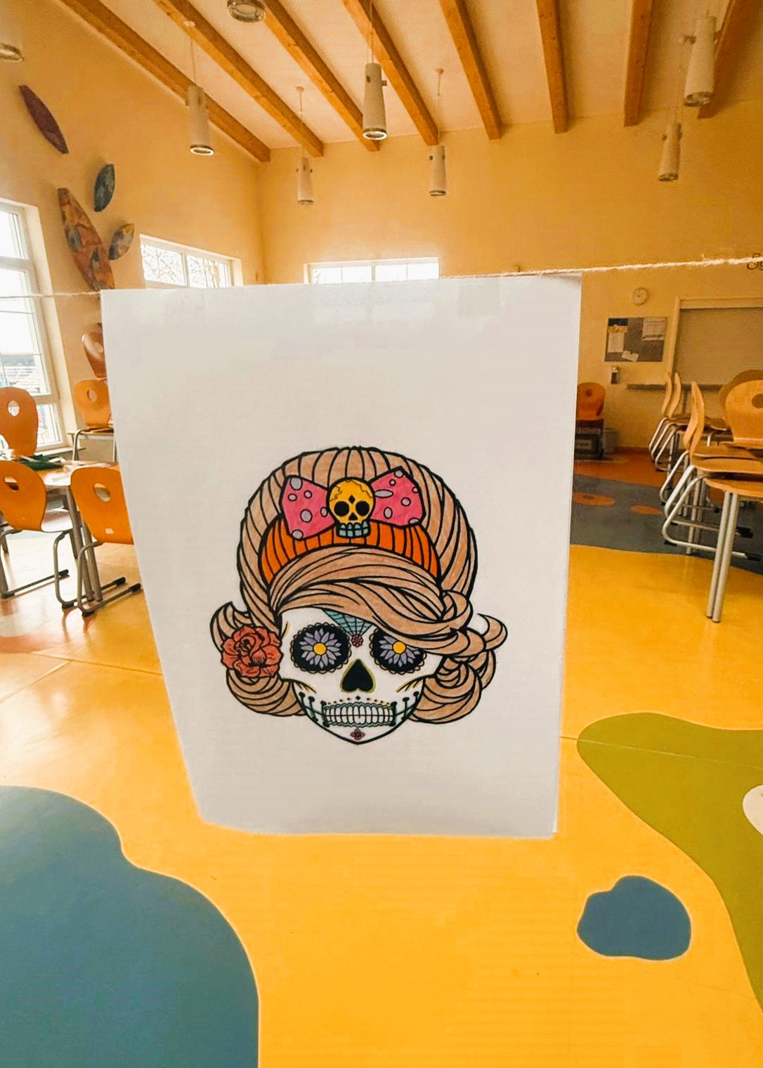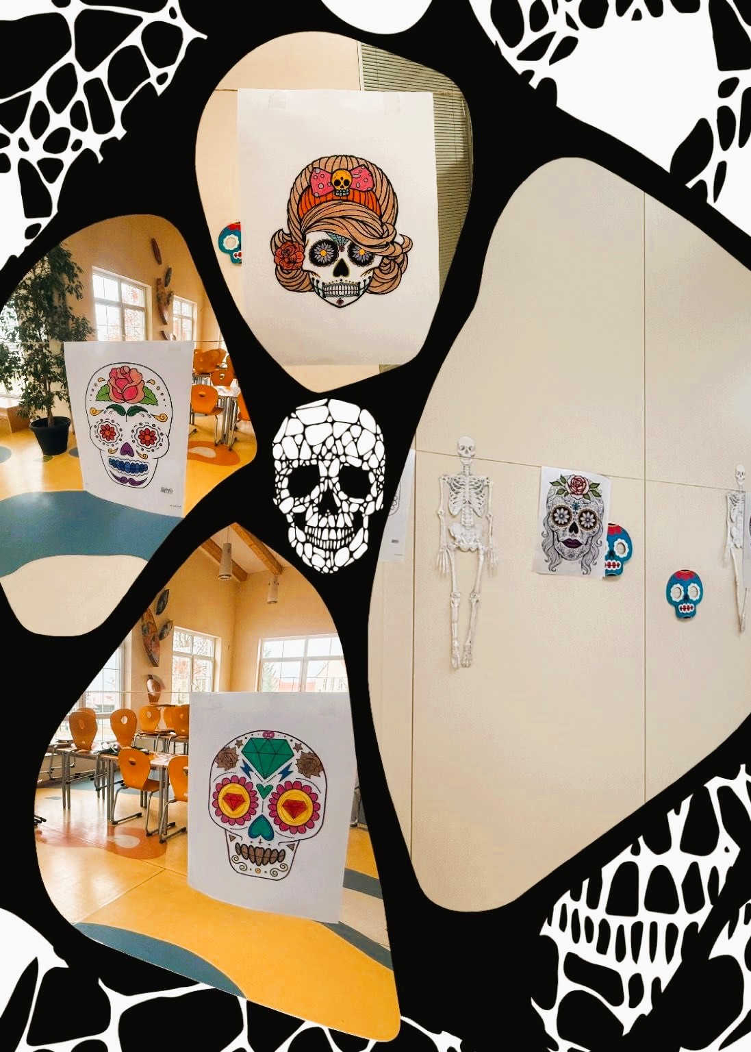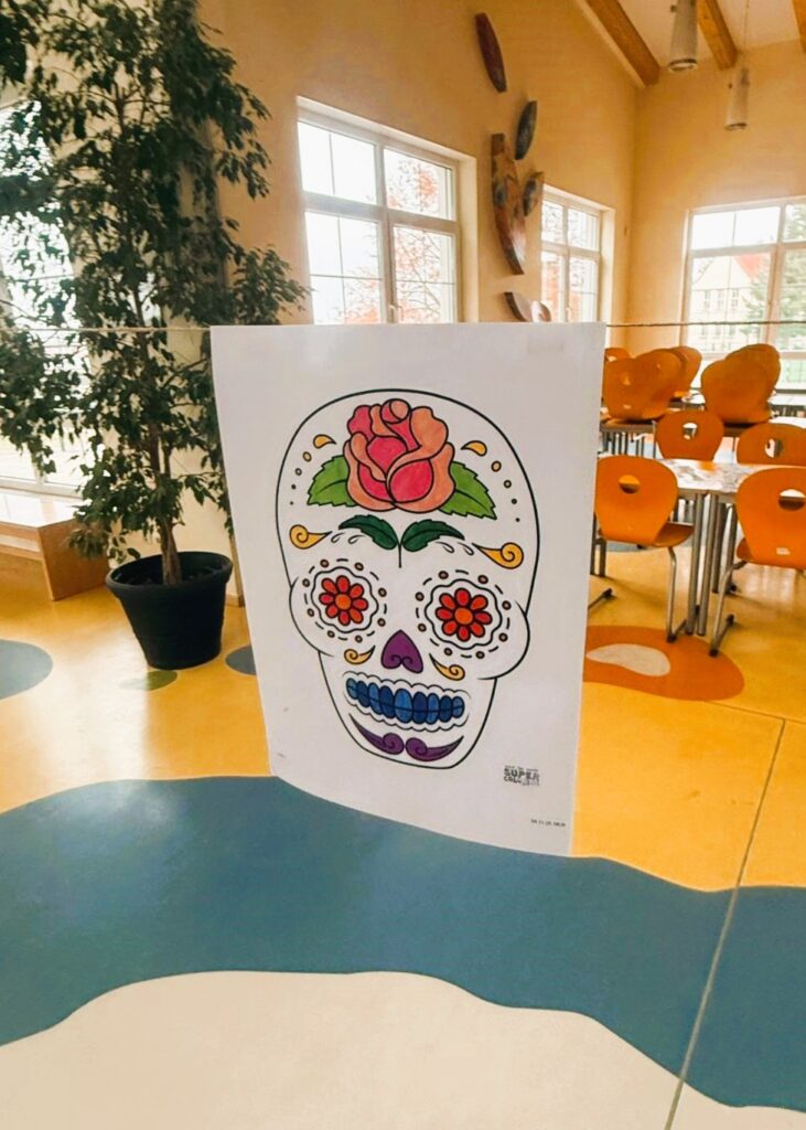 Auch wir hatten wieder unser Gymnasium an vielen Stellen mit farbigen Totenkopf-Motiven dekoriert. Die fröhliche Gestaltung machte anschaulich, dass der Día de los Muertos keineswegs ein Fest der Trauer und des Schmerzes ist, sondern ein Fest des freudigen Erinnerns an verstorbene Verwandte.