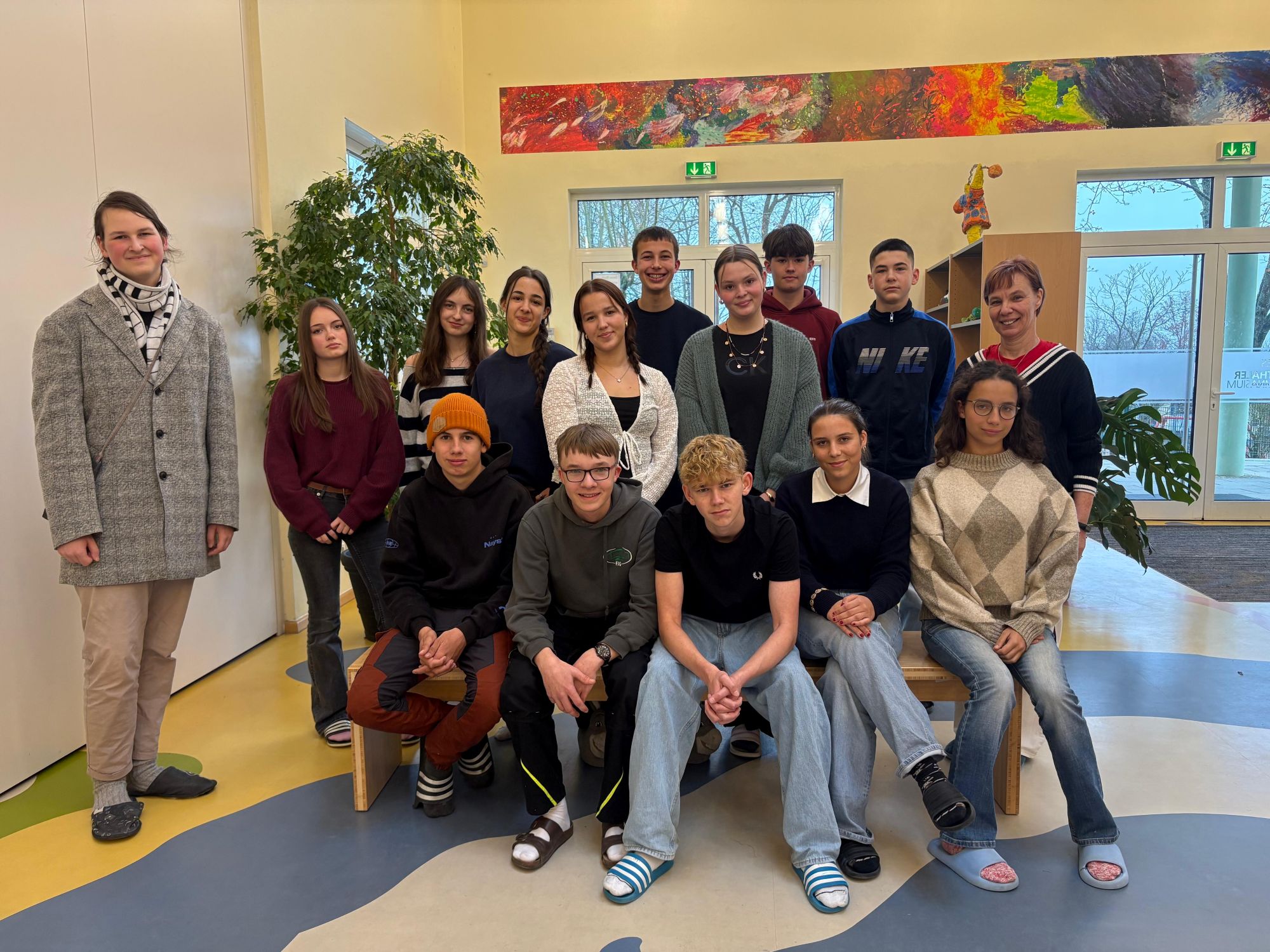 Und wir sind die Schüler:innen der Klasse 10, Lerngruppe 2 mit 11 Schüler:innen. Unser Klassenlehrer ist Herr Thiering. Unsere Klassensprecher:innen sind Linus, Emilia und Marlene.
